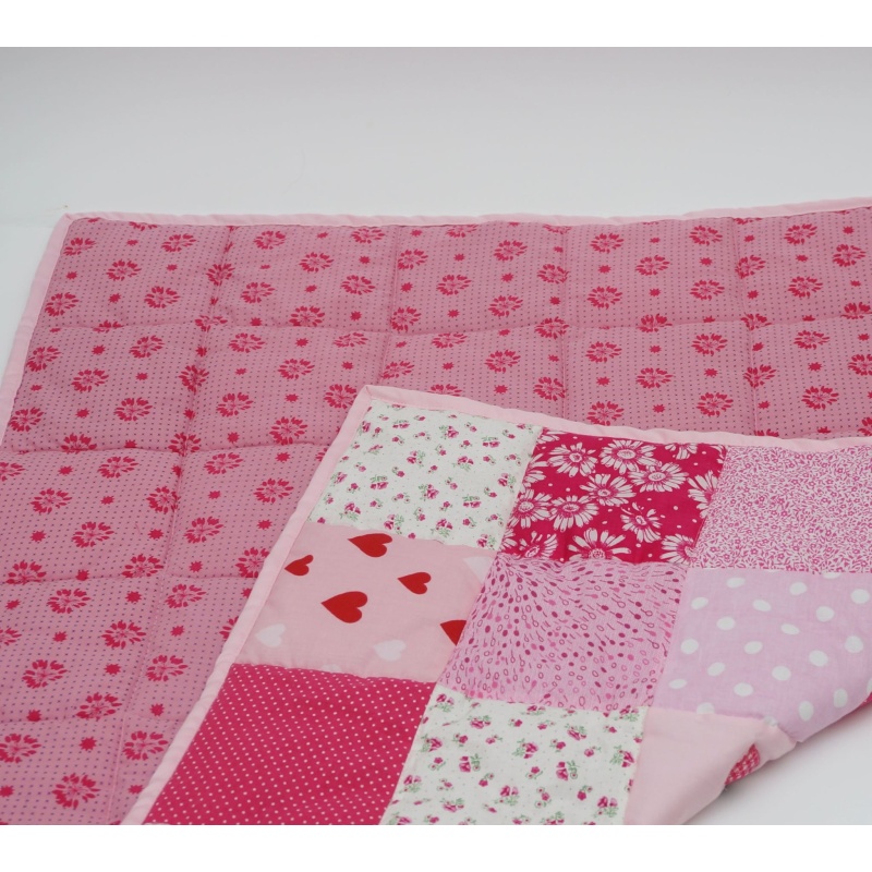 Materjal: puuvillased kangad, krõbisevad materjalid detailide sees, erineva tekstuuriga kangad. Kangad on läbi pestud. Rohked tepingud hoiavad teki ka peale pesu vormis. Täiteks mahuline vatiin (polüester).