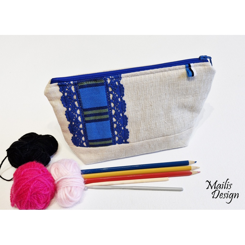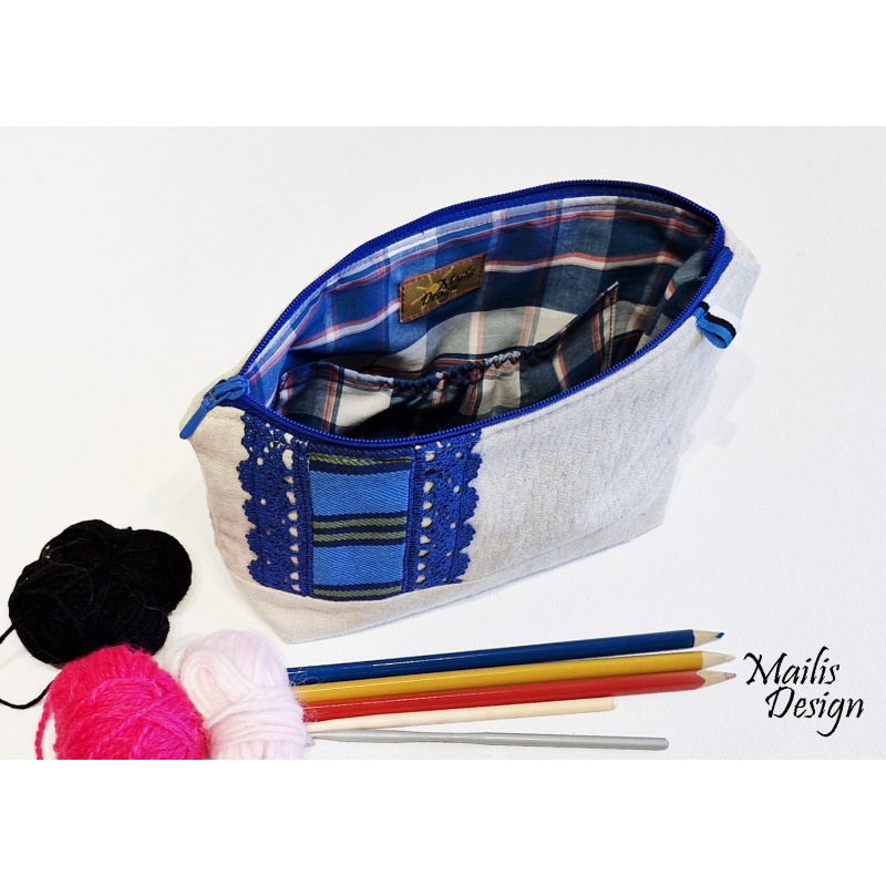 Kosmeetika kott linasest kangast ja rahvuslikust triibukangast, kaunistatud puuvillaste pitsidega. Koti peal on pisike sini-must-valge paelake. Vooder puuvillane kangas, sees on väike tasku.
