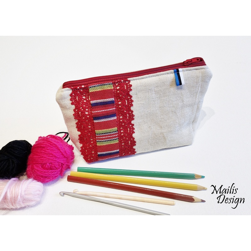 Kosmeetika kott linasest kangast ja rahvuslikust triibukangast, kaunistatud puuvillaste pitsidega. Koti peal on pisike sini-must-valge paelake. Vooder puuvillane kangas, sees on väike tasku.