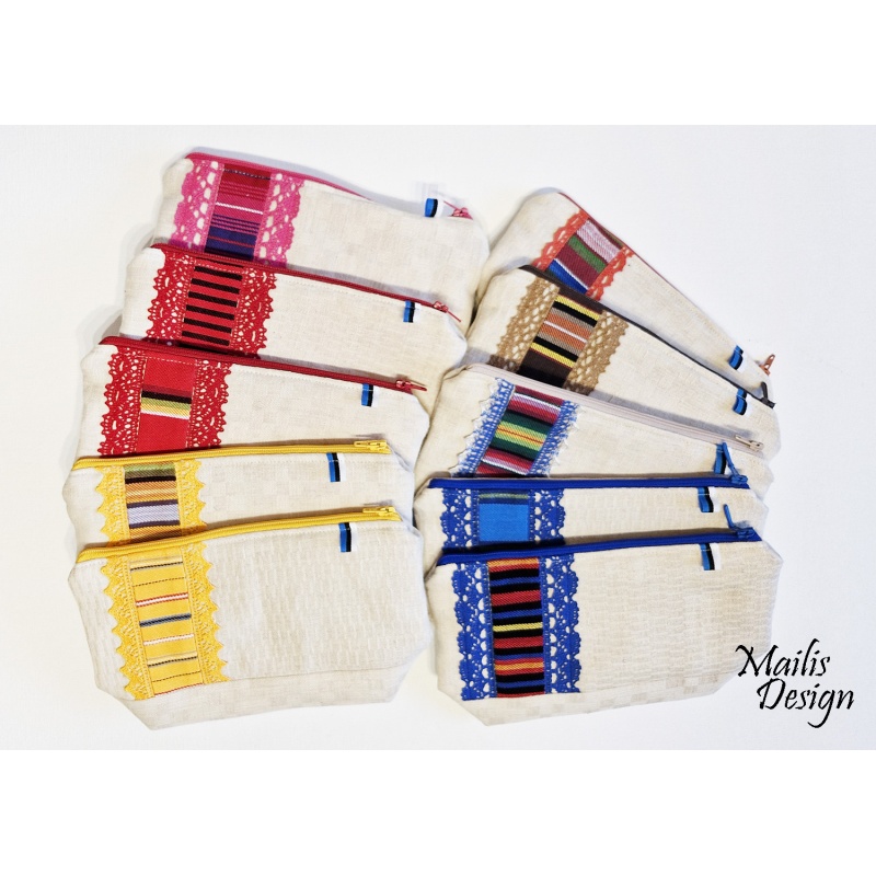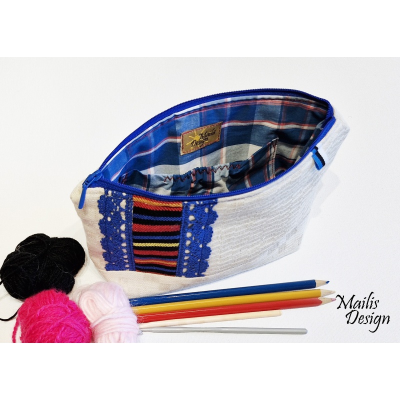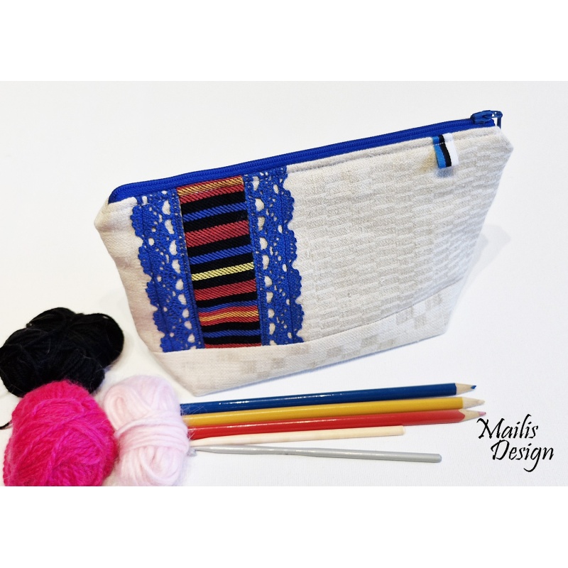 Kosmeetika kott linasest kangast ja rahvuslikust triibukangast, kaunistatud puuvillaste pitsidega. Koti peal on pisike sini-must-valge paelake. Vooder puuvillane kangas, sees on väike tasku.