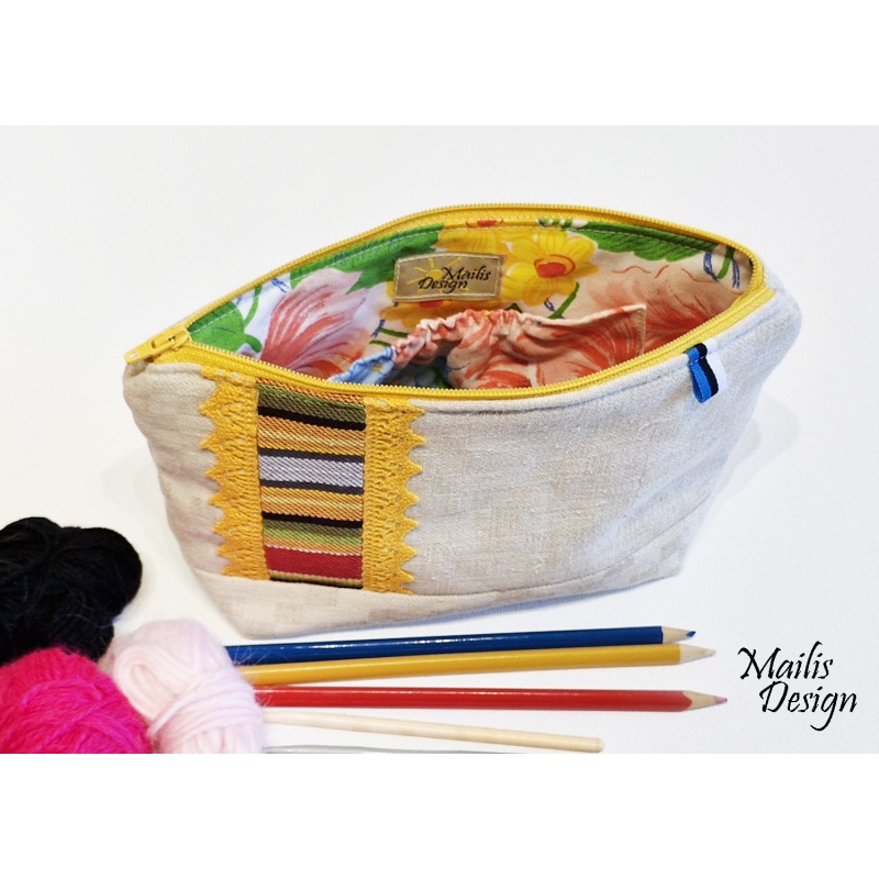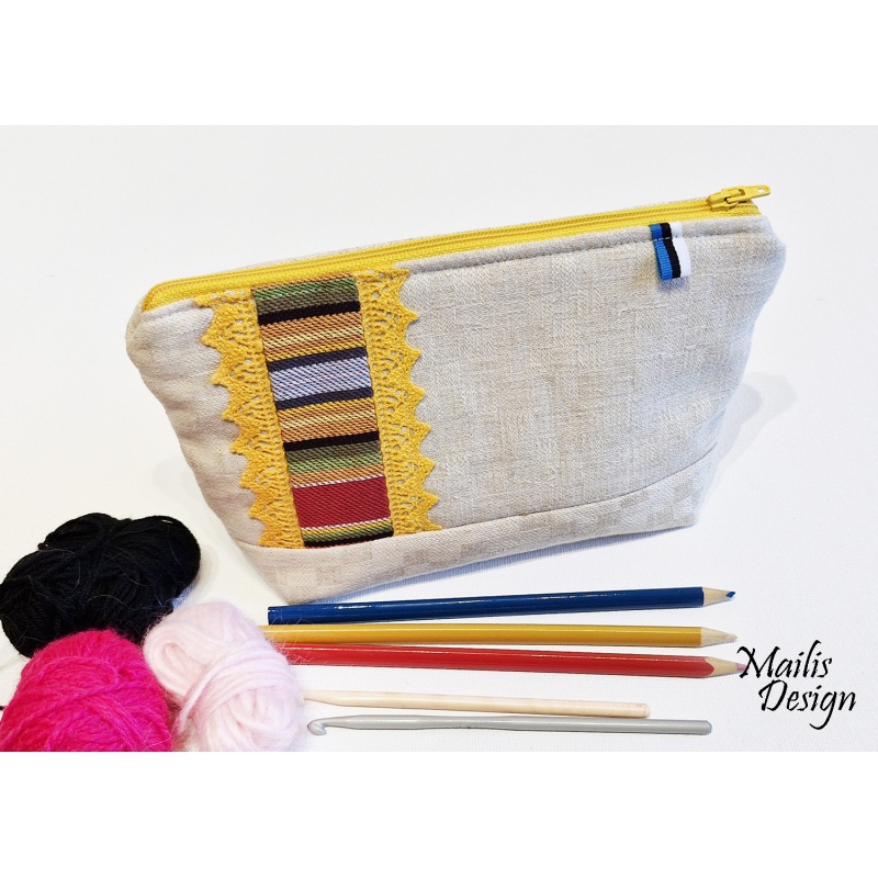 Kosmeetika kott linasest kangast ja rahvuslikust triibukangast, kaunistatud puuvillaste pitsidega. Koti peal on pisike sini-must-valge paelake. Vooder puuvillane kangas, sees on väike tasku.