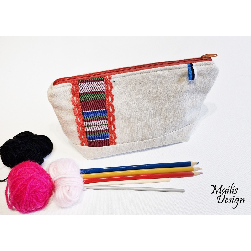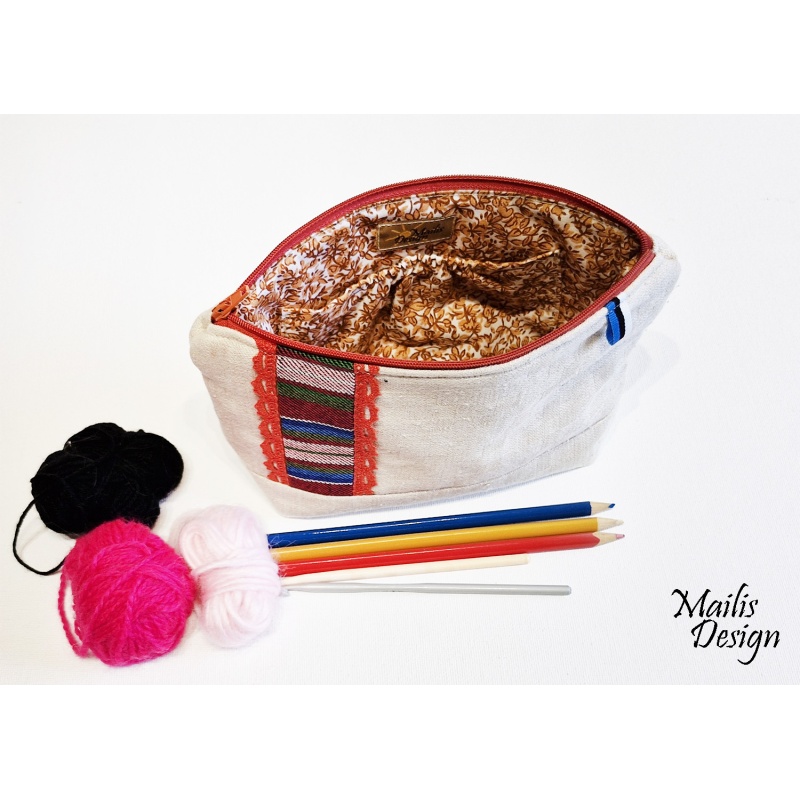 Kosmeetika kott linasest kangast ja rahvuslikust triibukangast, kaunistatud puuvillaste pitsidega. Koti peal on pisike sini-must-valge paelake. Vooder puuvillane kangas, sees on väike tasku.