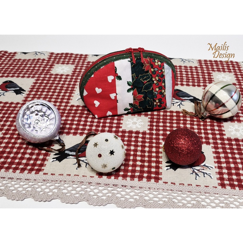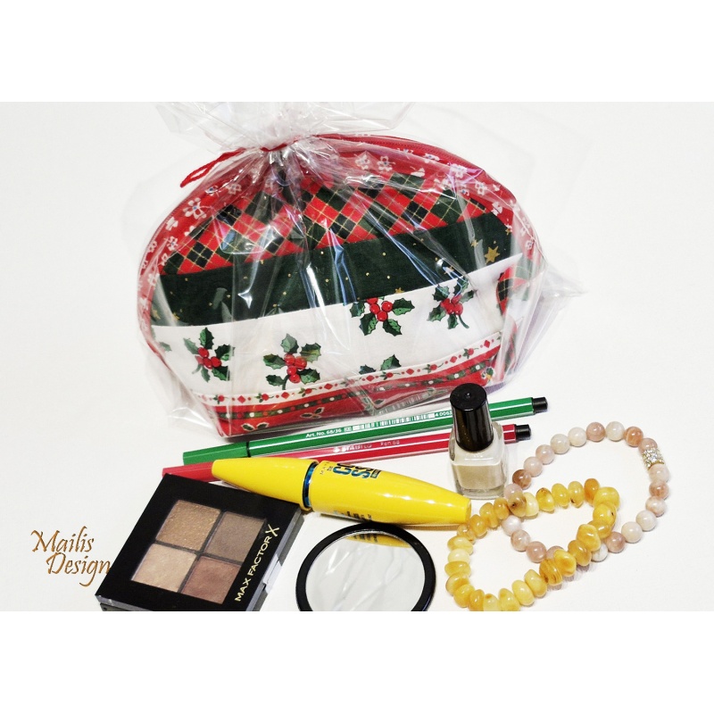Käsitööna, lapitehnikas valminud kosmeetika kott.