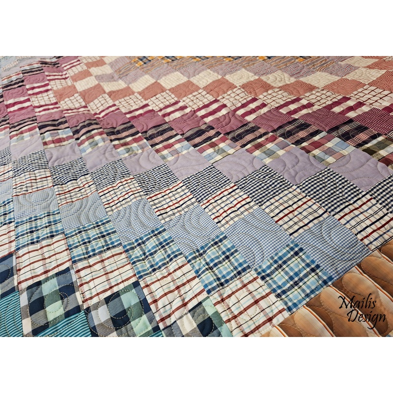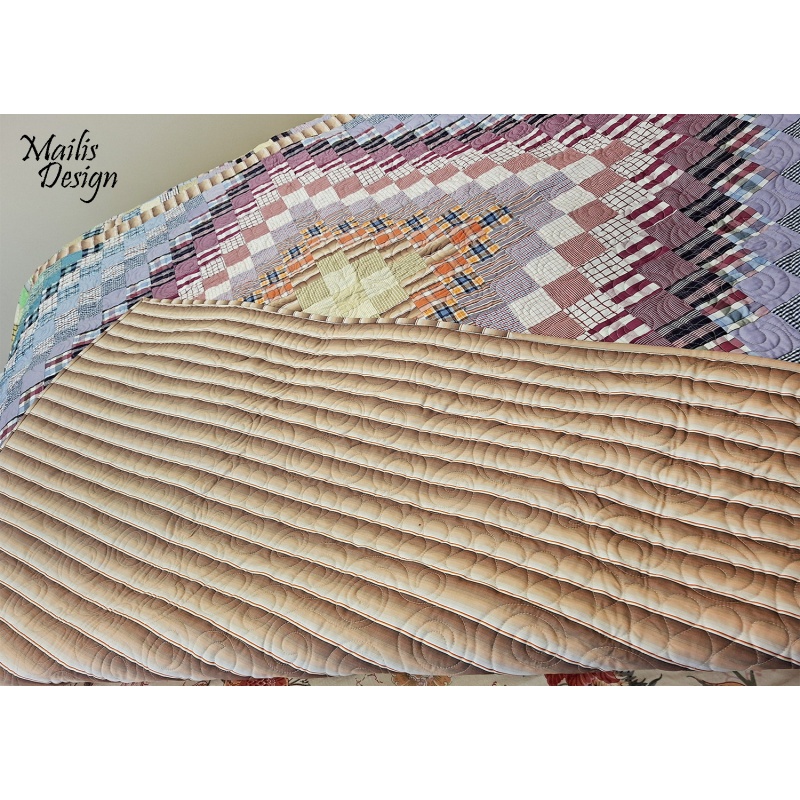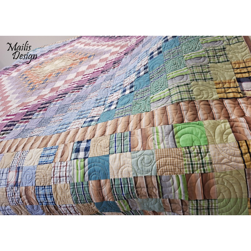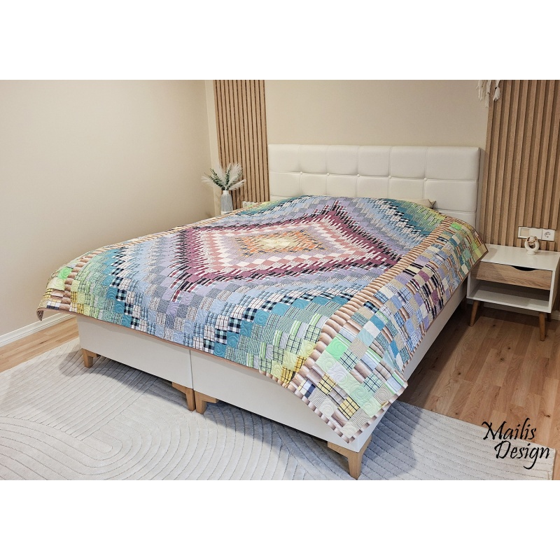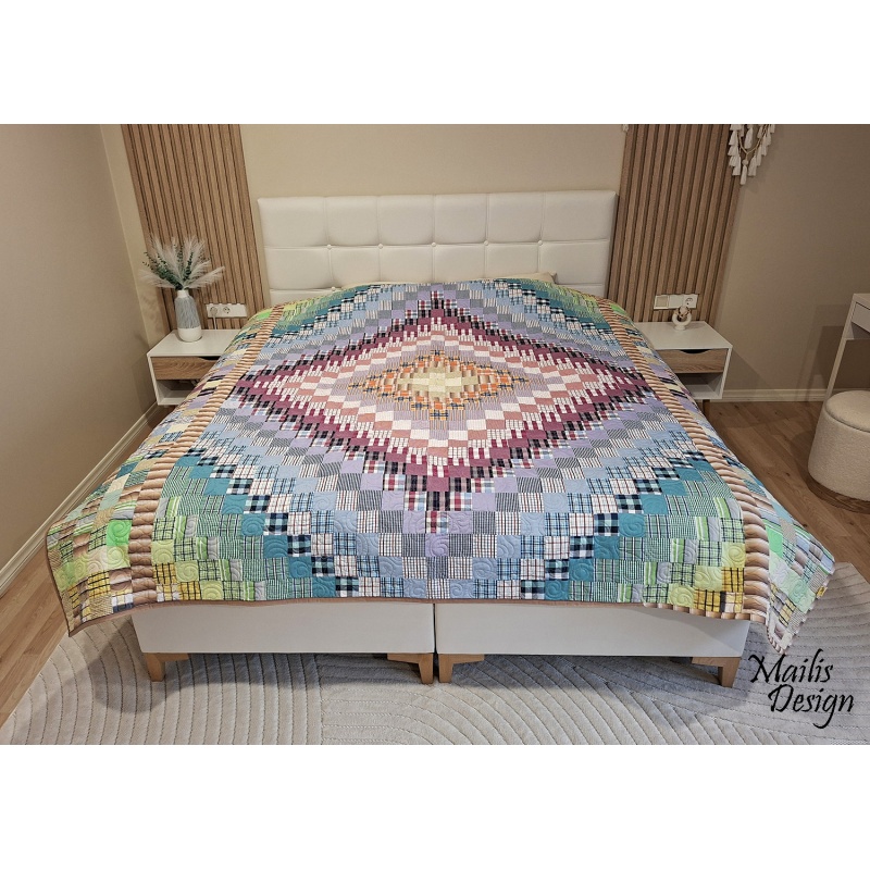 Lapitekk on õmmeldud pisikestest (8 x 8 cm) ruudukestest, triiksärkide tootmisjääkidest. Teki mustri nimi on Reis Ümber Maailma ning tekk ise sai nimeks VIRMALISED. Teki värvide valikuks sain inspiratsiooni tänavuse aasta erakordselt virmaliste rohkest suvest nii meil, Eestis, kui kaugel põhjas, Norras, kus oleme viimasel ajal koos perega palju aega veetnud ja selle imelist loodust nautinud.