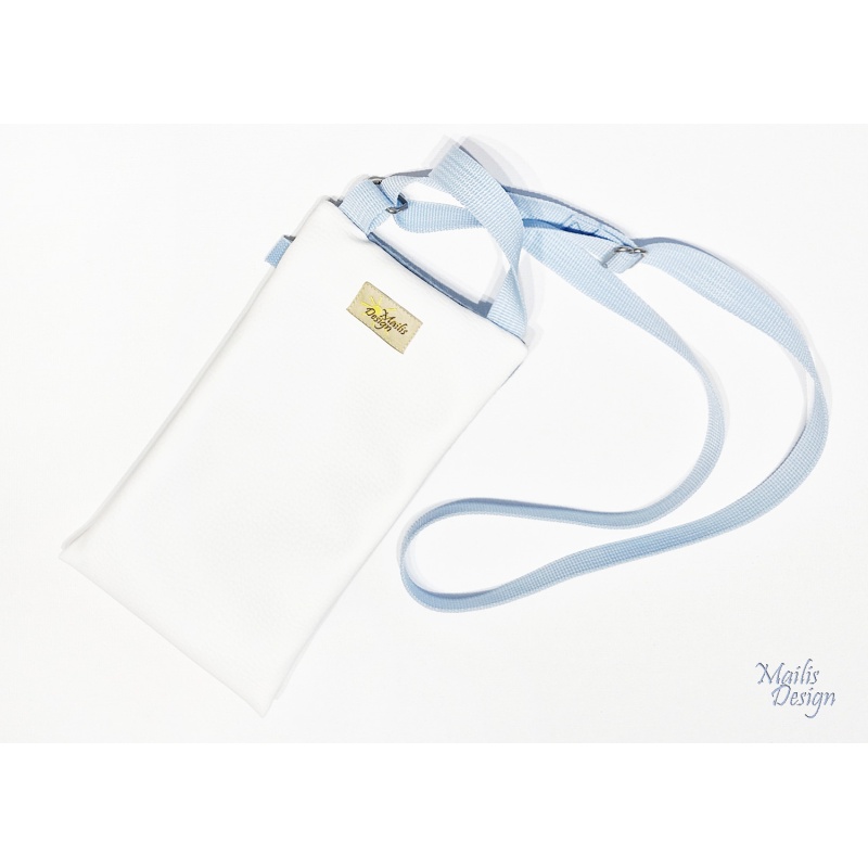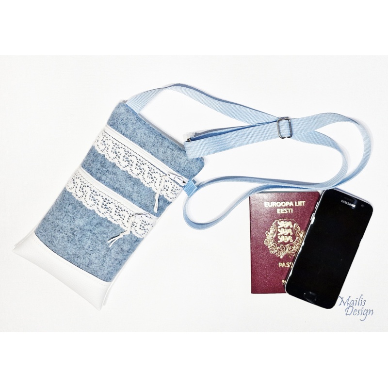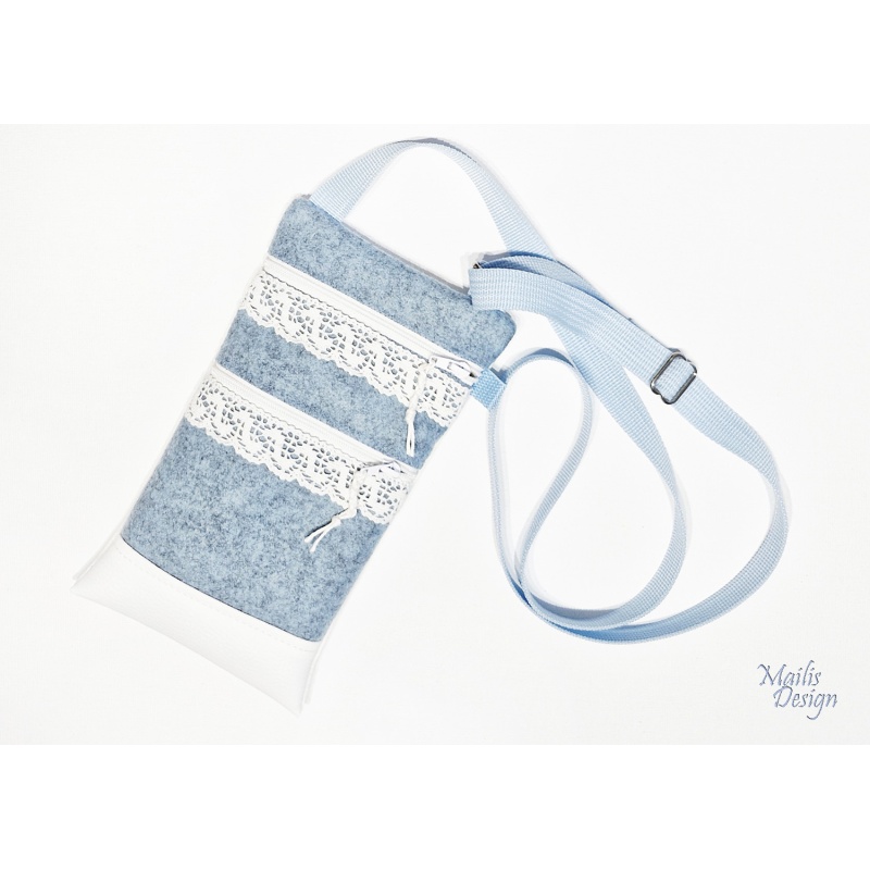 Mobiilikott/rahakott, 2 taskut, õlarihm, teksasinine/valge, pitsid