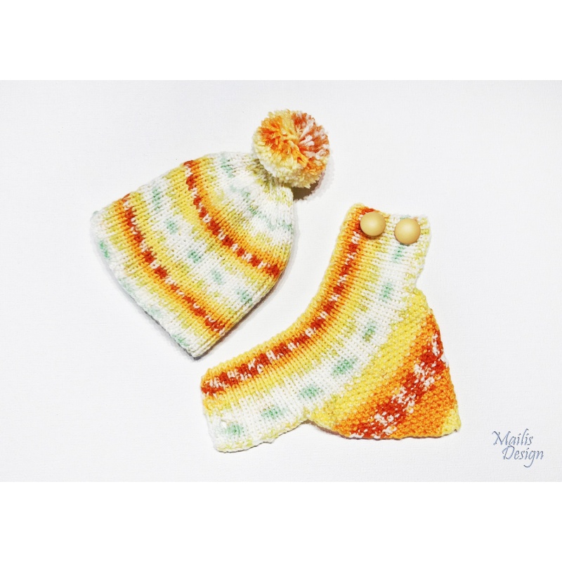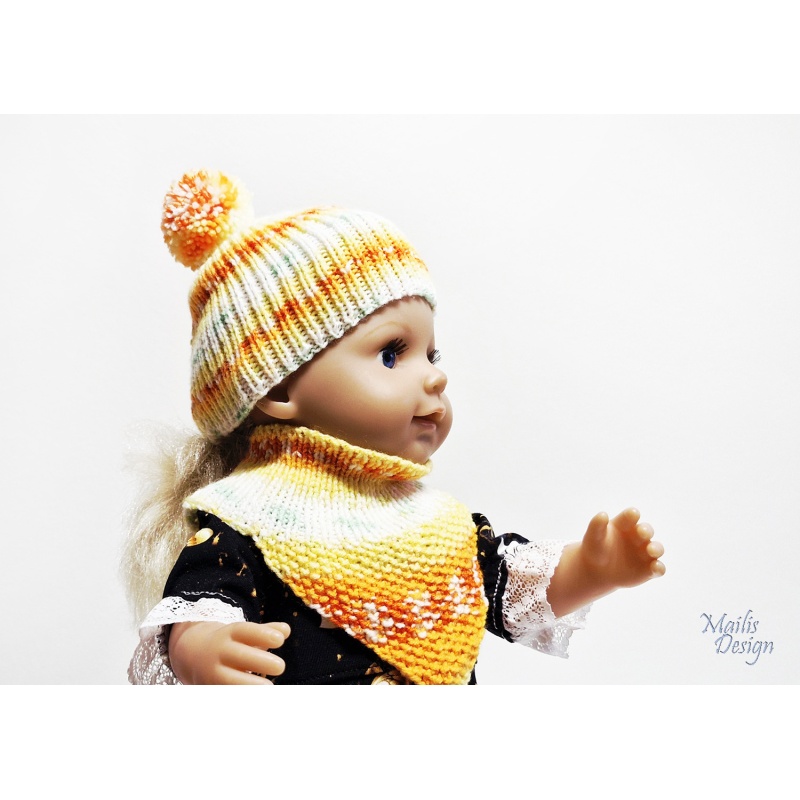 Käsitööna valminud nuku mütsi ja salli komplekt.