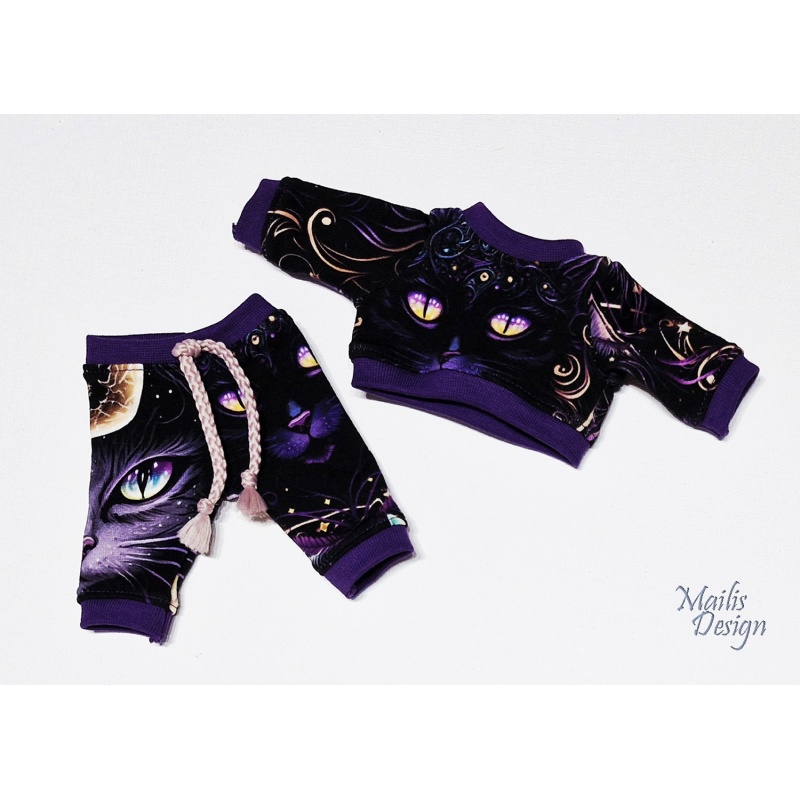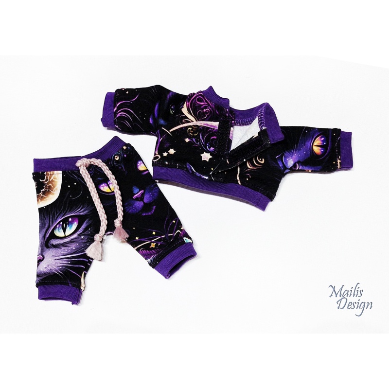 Pluusi pikkus 7 cm, varrukas kaelast 9 cm. Pükste pikkus 12 cm, värvel sobib 15-17 cm vöö ümbermõõdule.