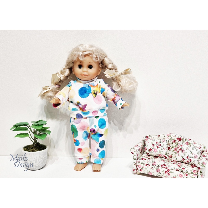 Käsitööna valminud nukuriiete komplekt nukkudele pikkuses 43-48 cm, keha ümbermõõdule max 35 cm.