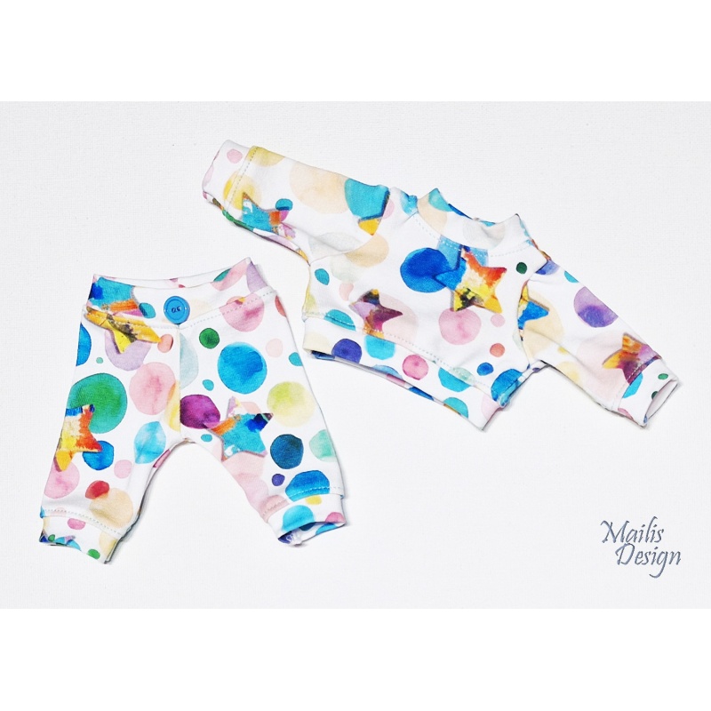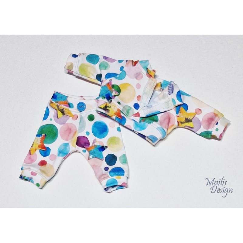Pluusi pikkus 7 cm, varrukas kaelast 9 cm. Pükste pikkus 12 cm, värvel sobib 15-17 cm vöö ümbermõõdule.