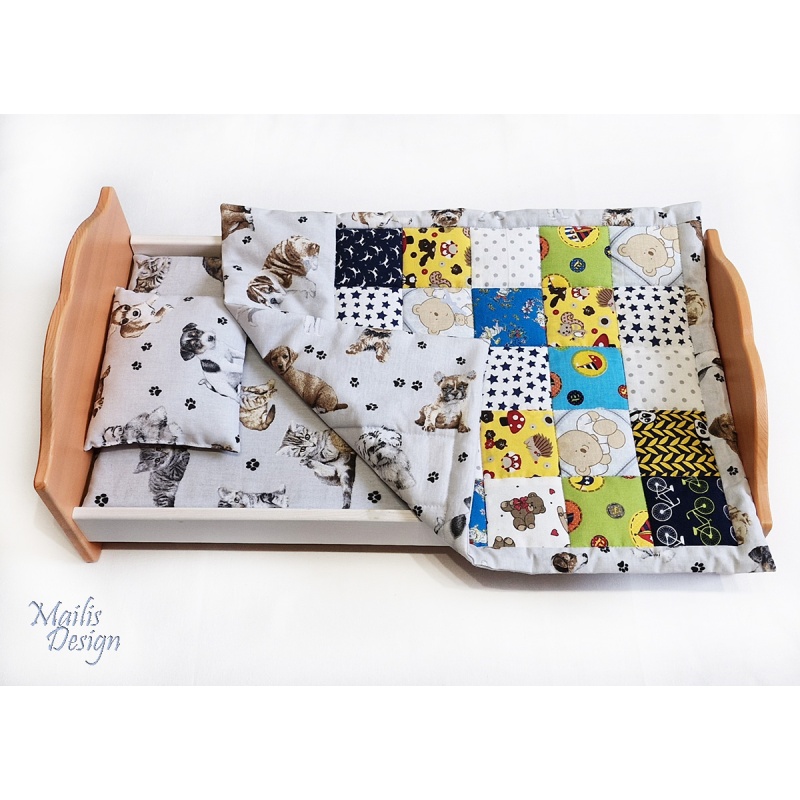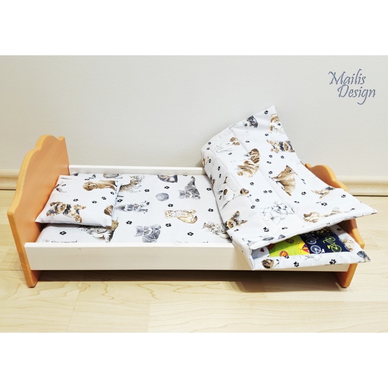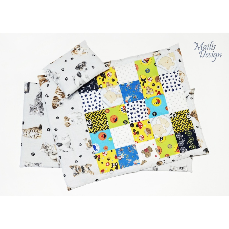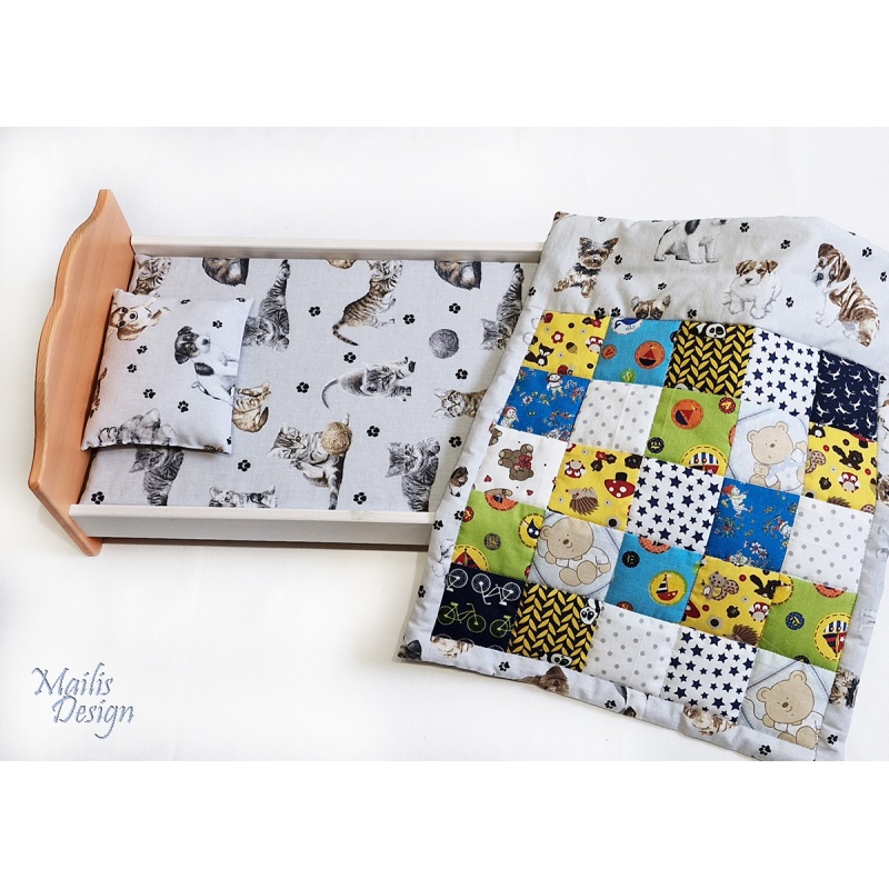 Voodipesu komplekt õmmeldud puuvillastest kangastest. Kanga muster hallil taustal kiisud ja kutsud. Tekk on lapitekk puuvillasest kangast, täiteks polüestervatiin.