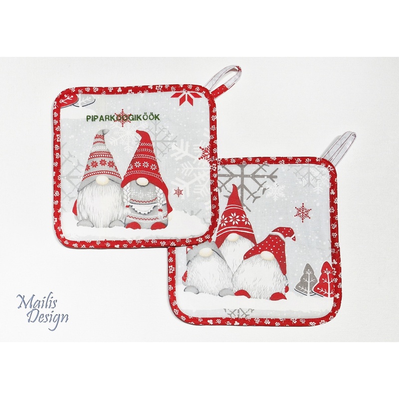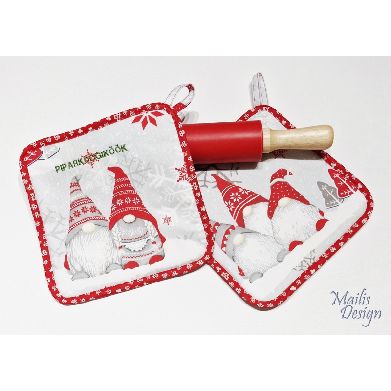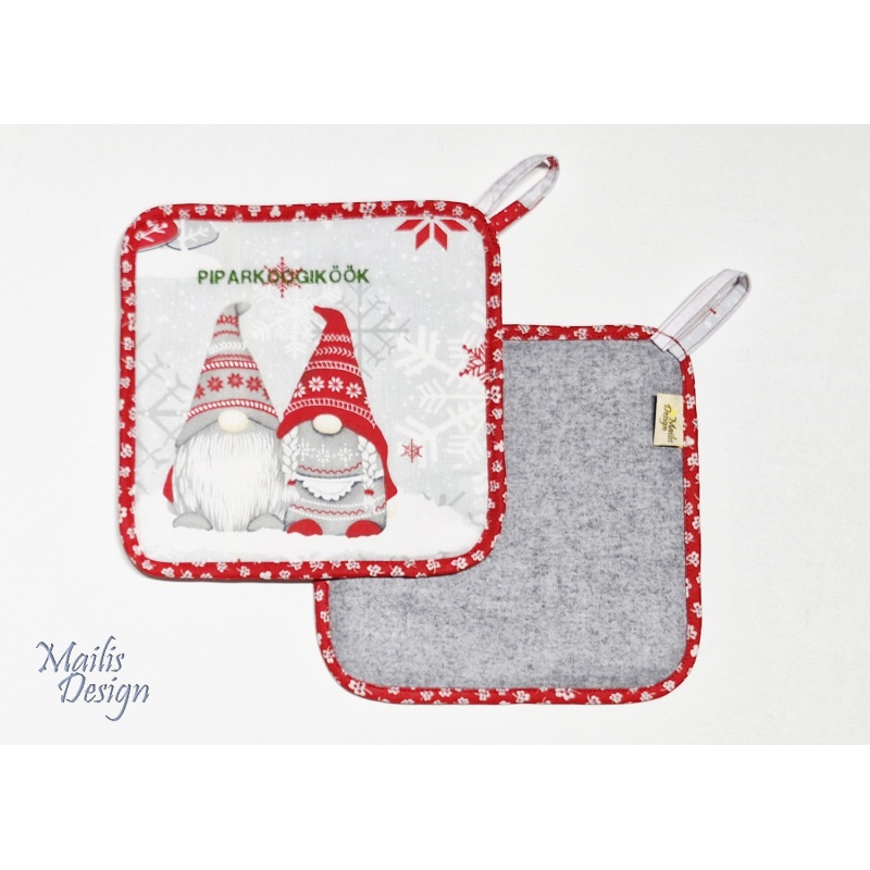 Käsitööna valminud pajalapid päkapikkudega ja tikitud sõnumiga.