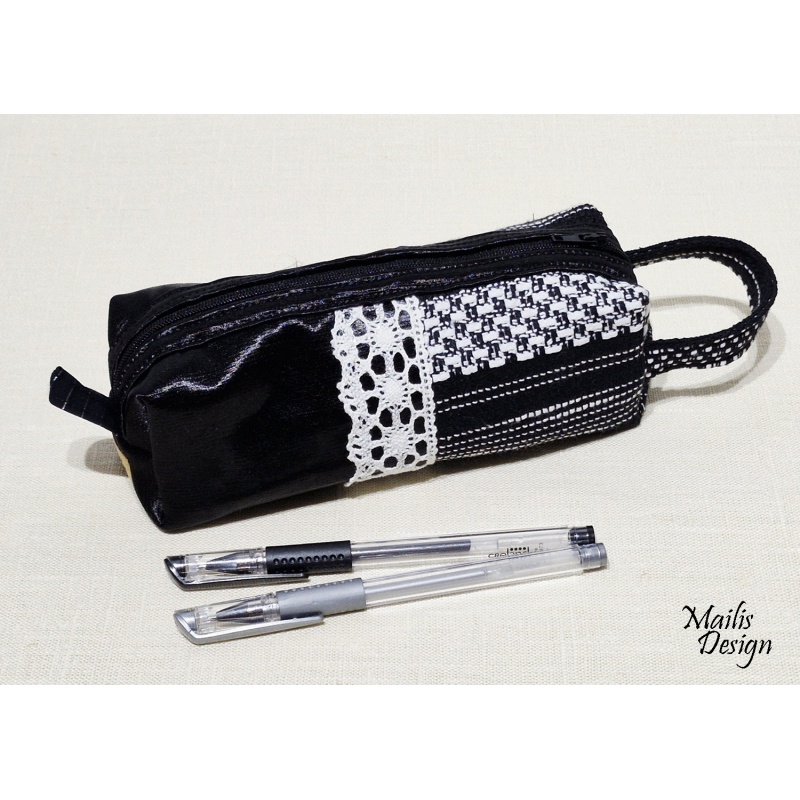Käsitööna valminud tekstiilist pinal, kosmeetika kott.