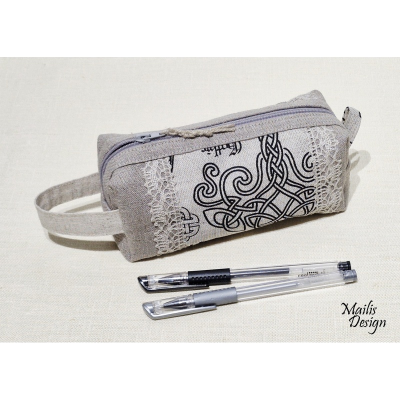 Käsitööna valminud tekstiilist pinal, kosmeetika kott.