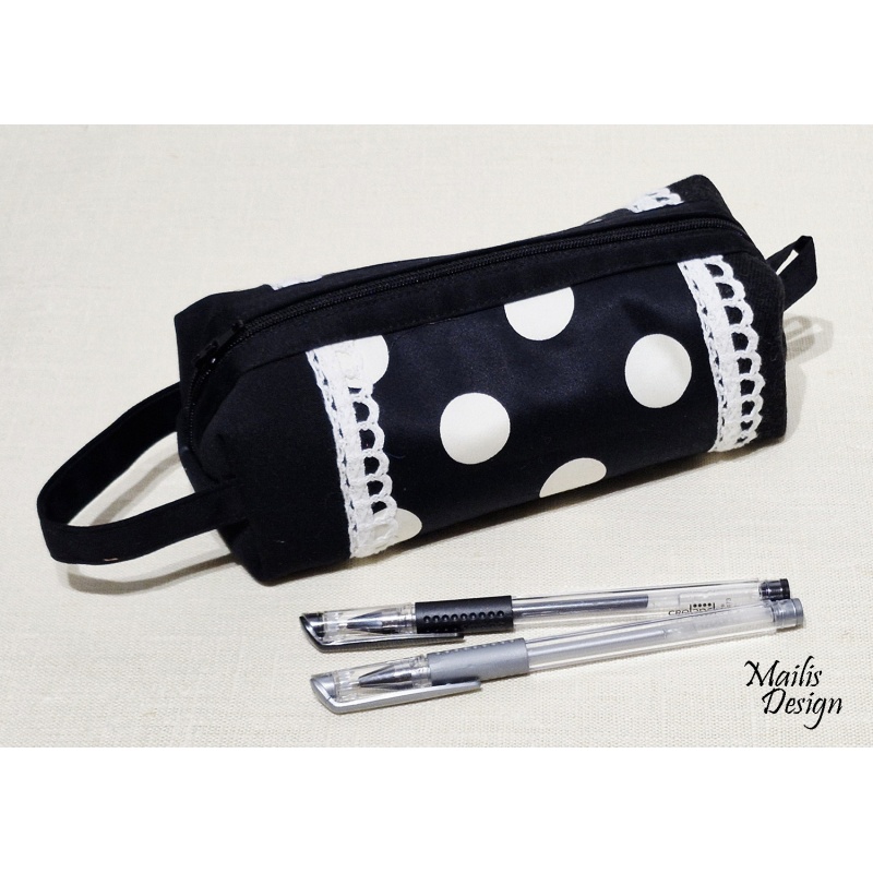 Materjal: puuvillane mummudega kangas ja must läikega kangas, kaunistuseks puuvillased pitsid, vooder puuvillane. Kõik tekstiilid on tööstusliku tootmise jäägid, uuele elule päästetud kangad. Kahe kanga vahel vatiin.
