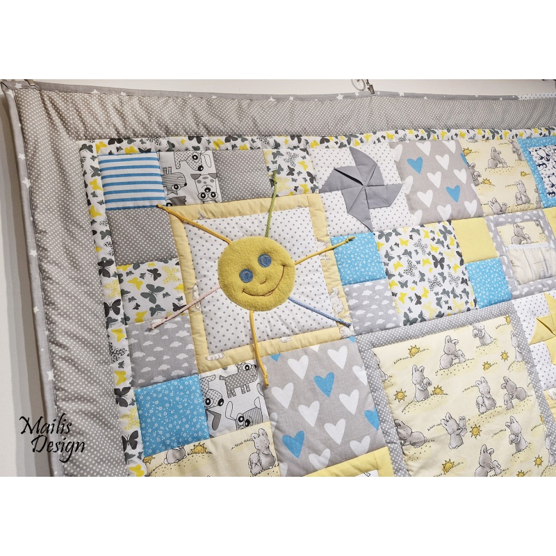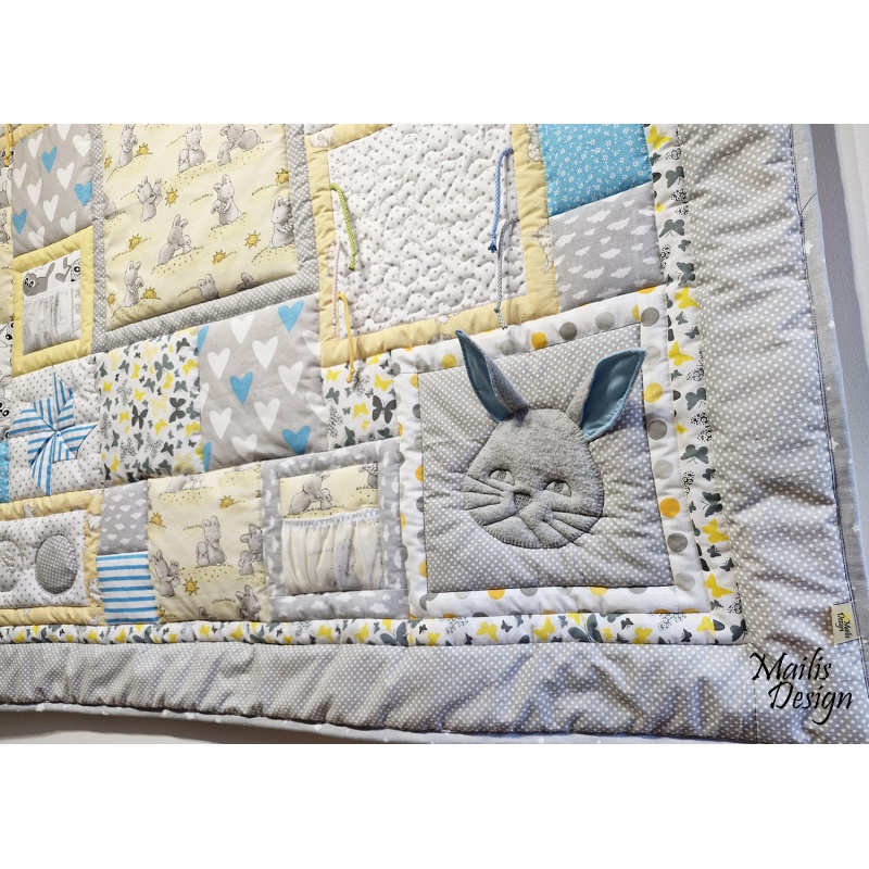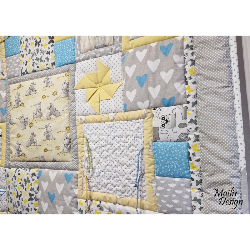 Materjal: puuvillased kangad, krõbisevad materjalid detailide sees, erineva tekstuuriga kangad. Kangad on läbi pestud. Rohked tepingud hoiavad teki ka peale pesu vormis. Täiteks mahuline vatiin (polüester).
